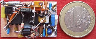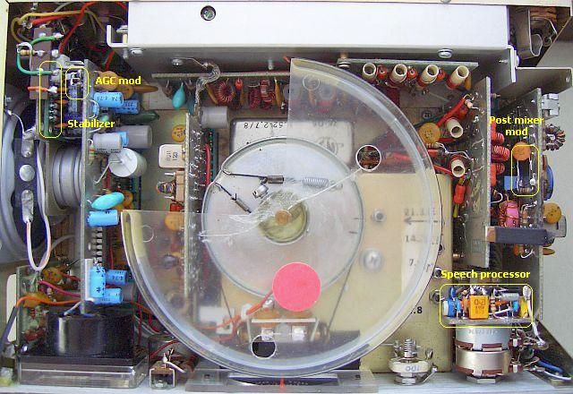 Omdat er bijna geen ruimte meer over was in mijn al met een VFO stabilisator uitgeruste Atlas215x, was een printontwerp (zonder SMD spul) te groot om te kunnen plaatsen. De beproefde "dode kever" methode en een selectie van de kleinste componenten die hier aanwezig waren, beperkte het formaat. Daarna was het mogelijk om de schakeling met sterke tweezijdig (Tesa) plakband aan de achterkant van de tweevoudige potmeters MIC.GAIN/ALC te bevestigen.