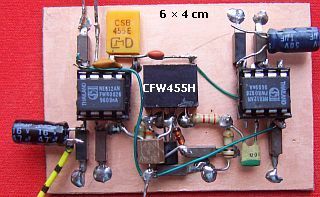 Eventueel («fig) te vervangen door een 5k0 potmeter en 1k0 weerstand om bij uw versie de instelling te verfijnen. Verder zorgt de transistor voor de nodige versterking naar het keramische CFW455H filter. Dit 455 kHz type moet aan de in en uitgang afgesloten worden met 2k0. Dat deed ik in eerste instantie, maar er werd geen verschil gemerkt met de hogere waarden in het schema.