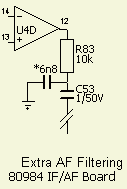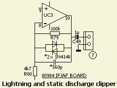 Omdat AGC afgeleid wordt van het laagfrequent signaal, zijn allerlei kraak en knakstoringen overduidelijk te merken en soms pijnlijk voor het gehoor. Een eenvoudige begrenzer («fig) zorgt ervoor dat zo'n piek wel op de S meter te zien is maar niet meer knallend uit de luidspreker komt. Door over de in en uitgang van UC3 op print IF/AF Board (80984) twee antiparallel geschakelde diodes 1N4148 over R79 (100k?) te monteren wordt dat effect bereikt. Nog een extra 560 pF parallel verzwakt door tegenkoppeling de hogere frequenties van het spraakgebied. Om dezelfde (persoonlijke smaak) redenen werd verderop in de laagfrequent (fig») versterker op dezelfde print IF/AF Board (80984) een condensator van 6.8 nF als ontkoppeling van weerstand R83 (10 k?) aangebracht.