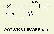 Naar mijn smaak was de werking van de (hang) AGC te traag en dat werd verbeterd door het ontladen van een condensator te versnellen met een kleinere weerstandswaarde op print IF/AF Board (80984). Het gemakkelijkste gaat dat door parallel aan R46 (10 M?) een weerstand van 2.2 M? te monteren. Eventueel kunt u ook R46 verwijderen en dan vervangen door 1.8 M?.