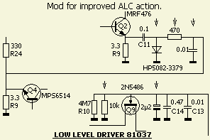 Gezien alle voorgaande onderzoeken leek het niet onwaarschijnlijk dat de diode de boosdoener was. Na vervanging door een nieuw exemplaar bleek dat ook bij mij de component weliswaar niet defect was, maar niet meer goed zijn werk deed. Het uitgezonden signaal werd hoorbaar en op de scoop zichtbaar beter. Toch was ik nog niet tevreden over de werking van het ALC systeem. De aanspreek en afvaltijd constanten werden daarom veranderd door (fig») het aanbrengen van 10 k? en 2,2 µF parallel aan de gate van transistor Q2. Nog meer verbetering trad op toen transistor Q2 ook in het regelsysteem werd opgenomen door een variabele ontkoppeling van source weerstand R9. Daar zorgt een PIN diode voor die gemonteerd werd door C11 van massa los te maken en daartussen de diode te solderen. De regelspanning werd verkregen via een serieweerstand naar de emitter van Q4.