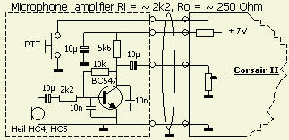 Een Corsair is nogal gevoelig voor HF terugwerking, vooral als er met een HF lineair gewerkt wordt. Daarom werd voor de versterker een transistor gebruikt dat op eenvoudige wijze door ontkoppeling HF ongevoelig gemaakt kan worden. De eerste versterker was ook een transistor met eigenlijk teveel versterking. De volgende was een operationele versterker, maar dat bleef ondanks filtering en ontkoppeling gevoelig voor HF. Daarom werd maar weer overgeschakeld op een systeem met transistor.