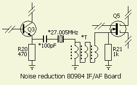 Om ruis dat in een IF versterker ontstaat te verminderen, plaatst men in de betere ontvangers een extra IF filter net voor de demodulator. Een kostbare methode en hier werd dat effect, na enige experimenten, bereikt met een standaard 27.005 MHz kristal («fig, zijn die er nog?). Een koppeling tussen Q3 en Q5 op print IF/AF Board (80984) vindt plaats met een 1 ÷ 9 impedantie autotransformator gemaakt met een ferriet varkensneusje. Het aantal windingen weet ik niet meer, maar als de set weer eens open moet zal dat nog geteld worden. Men kan eventueel de 100 pF condensator tijdelijk vervangen door een trimmer voor afregeling op maximale uitslag van de S meter.