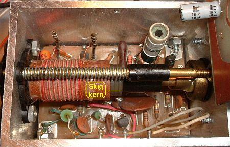 Ook in mijn Corsair trad dat verschijnsel tenslotte op en na een langdurige aarzeling, het zou een behoorlijke klus worden, werd de PTO uitgebouwd. Alle mechanische delen werden voor zover dat mogelijk was gedemonteerd, opnieuw gesmeerd en weer in elkaar gezet. Aanvankelijk was dat de remedie voor het jankerige gedrag maar na geruime tijd stak het weer de kop op. Uiteindelijk bleek dat het lag aan het schuren van de beweegbare poederijzer kern (fig») tegen de binnenkant van de spoelvorm. Als er aan de PTO gedraaid werd, bewoog de kern zich schokkerig in de spoelvorm en dat veroorzaakte het ogenschijnlijk instabiele gedrag. Ook tijdens een QSO kon de kern "los" komen en dan veranderde de frequentie een tiental Herz. De oplossing was het goed centreren van de kern en insmeren met bij voorbeeld siliconenspray zodat een vloeiende beweging zonder wrijving mogelijk werd.