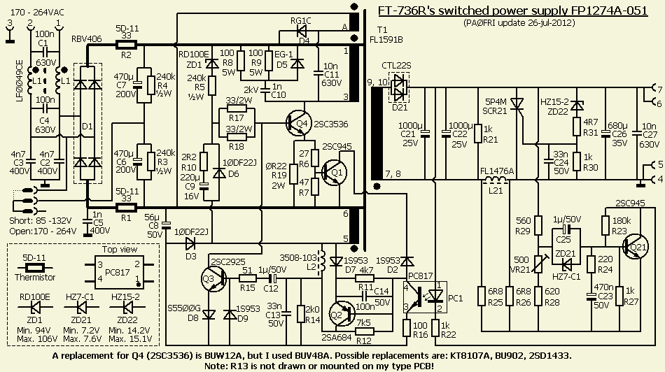 The schematics of FT-736R's switched power supply are on Internet, apart from DL7VHF's, not clear images. In this article I paid more attention to it and some components are mounted differently.