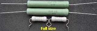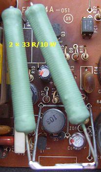 Instead of two small resistors a pair of 33 W Ω/10 types (fig») with long wire ends is used. This produces a reduced thermal conductivity onto the PCB and a better functioning of the cooling. To install the longer resistors above the PCB a jumper was removed and replaced by a "U" shaped jumper as support and contact pin.