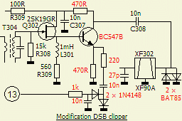 De voorgaande schakeling kan uitgebreid worden tot een IF dubbel zijband clipper/processor om het gemiddelde zendvermogen wat op te krikken. Een echte SSB IF begrenzer met een tweede IF filter is nog mooier, maar daar is vrijwel geen plaats voor in een FT-7 of FT-7B. Zo'n DSB clipper heb ik ook al met succes aangebracht in onder andere een TS-50S.
