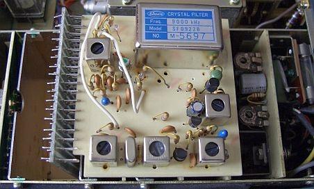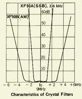 Het middenfrequent filter is een 9 MHz YAESU type XF-90A. Het is 2.6 kHz breed en de draaggolf frequenties zijn 8998.5 kHz en 9001.5 kHz. In mijn set kreeg ik een gelijkluidende klank met USB en LSB en dezelfde "kerstboompjes" op een scoop als de beide draaggolven ingesteld werden op 8998.3 en 9001.5 kHz.