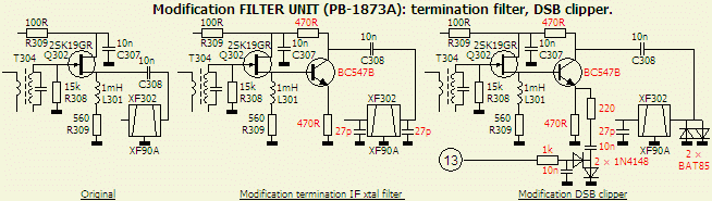 Volgens het originele schema wordt de ingang van het kristalfilter gekoppeld aan een (te) lage source impedantie van Q302 (2SK19GR). Gewoonlijk moeten dergelijke 9 MHz filters aan de in en uitgang een reflectievrije impedantie zien van 500 Ω. Door het monteren van een transistor met een factor 1 versterking en een 470 Ω collectorweerstand is het filter op de juiste wijze belast. Zulke filters moeten eigenlijk aan de in en uitgang ook nog een condensator van 30 pF parallel hebben.