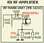 Naar mijn mening versterkt de HF voorversterker Q104 (3SK40M) aan de ingang van de ontvanger teveel en dat werd getemperd door de ontkoppel condensator C113 met 100 pF te vervangen. In een later stadium heb ik de weerstand R108 zelfs helemaal niet meer ontkoppeld met een condensator, omdat de set niet aan een mobiel maar aan een langere antenne geknoopt wordt.