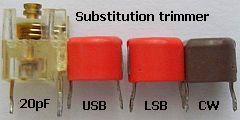 Kennelijk was door vorige eigenaars veelvuldig met de draaggolf trimmers gespeeld, want goed instellen bij het draaien was door verspringen van de frequentie niet eenvoudig. De originele trimmers voor SSB zijn 20 pF en voor CW 60 pF. De afgebeelde («fig) 20 pF folietrimmer (Philips) heeft dezelfde pinafstand en werd dan ook als vervanger (fig») gemonteerd. Om de juiste frequentie te bereiken was een condensator van 33 pF parallel aan de CW trimmer nodig. Montage was geen probleem want aan de sporenzijde van de print waren twee ongebruikte eilandjes, waarschijnlijk (uit voorzorg) bestemd voor zo'n extra capaciteit.
