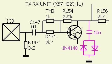 The clipper (fig») consist of a pair of back-to-back 1N4148 diodes in series with a 10 nF DC-blocking capacitor. It is connected between the collector of Q42 and earth (threaded bushing A1) on the TX-RX UNIT (X57-4220-11). Q42 is the 10.695 MHz double-sideband amplifier between the balanced modulator IC8 and the 2.4 kHz SSB filter. The latter removes intermodulation products of the clipping process outside the normal pass band. This clipper also eliminates the tendency of the TS-50 to splatter when speaking into the microphone too loudly.