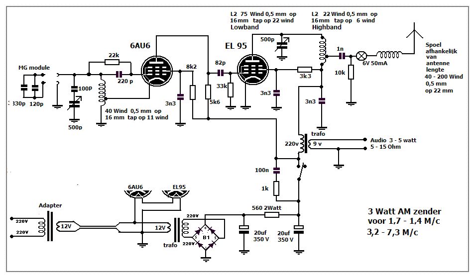 omlaag gebracht naar 1,4 tot 1,7 Mc zodat de zender ook