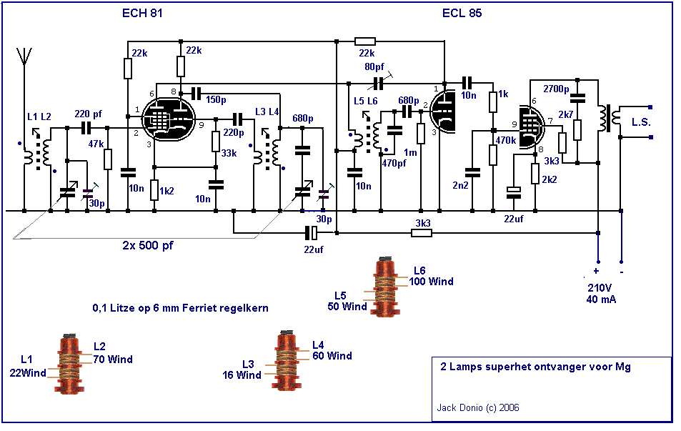 Deze ontvanger is ondanks zijn eenvoud toch een volwaardige superhet met een mf van 455 Kc