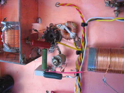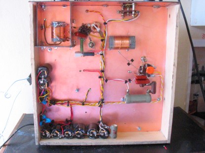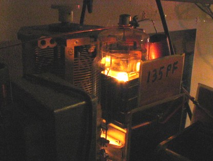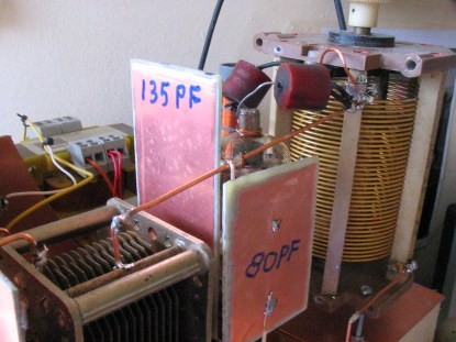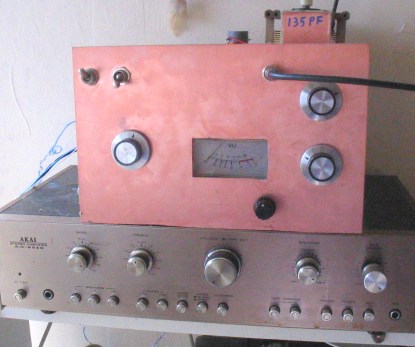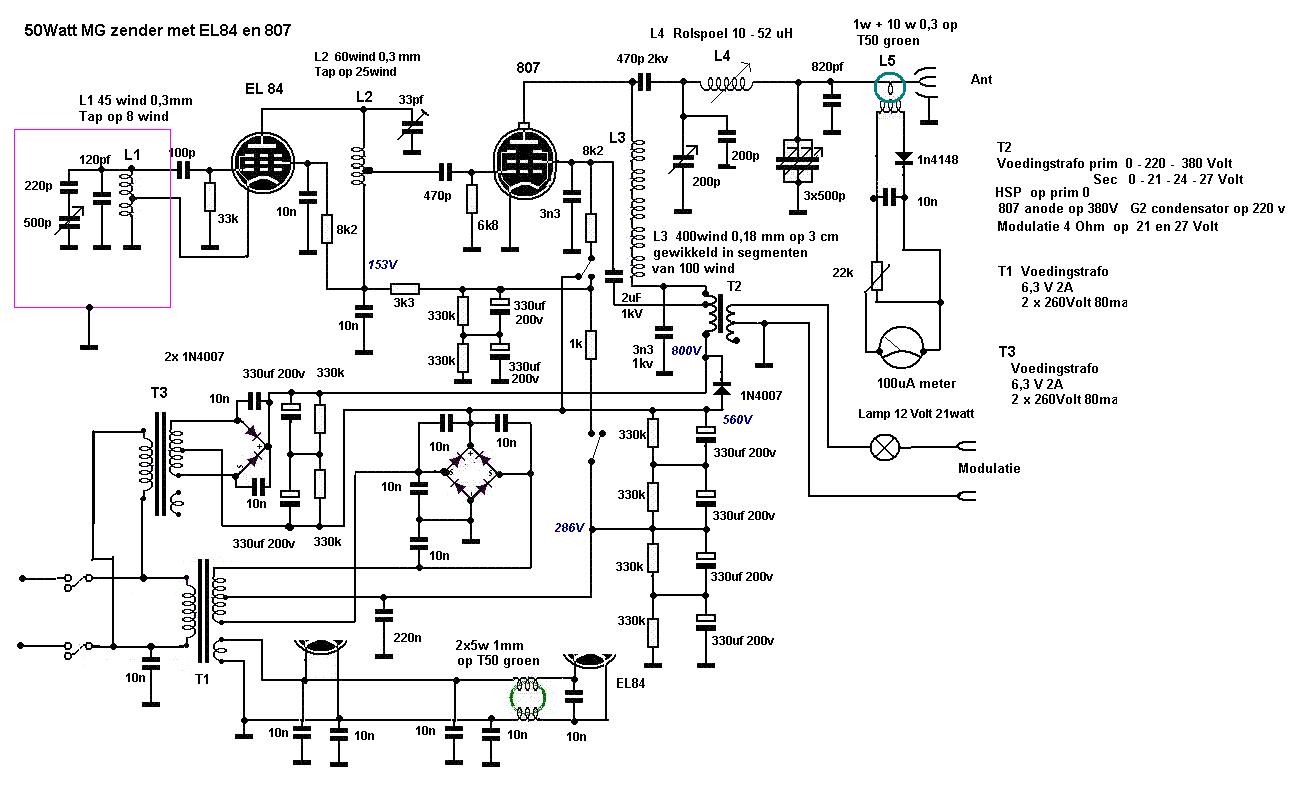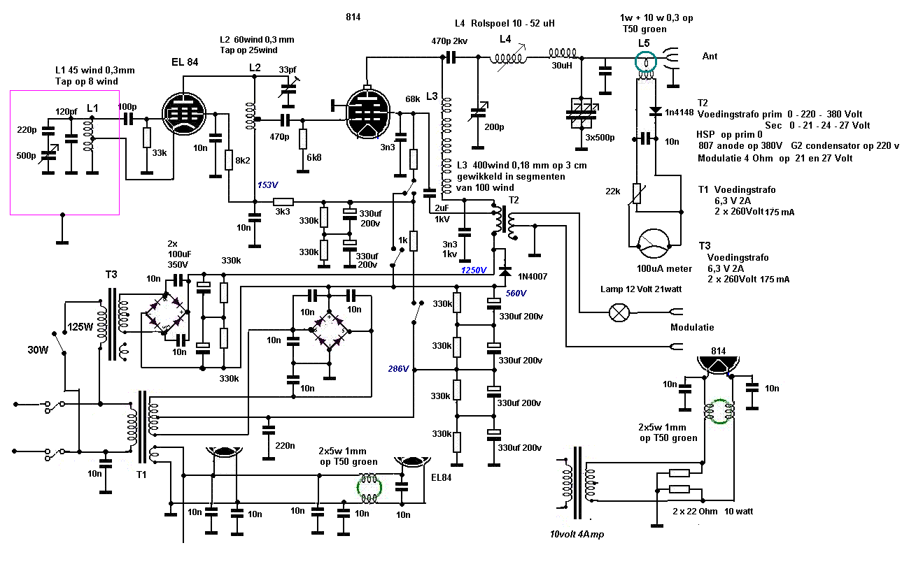 buizenzender gemaakt . Het is een eenvoudig ontwerp geworden , een EL 84 als oscilator met daarachter direct de 807 . Hier is eigelijk niet zo heel veel over te vertellen , de EL84 oscileert op de normale manier met een afstemspoel tussen ground en stuurrooster , Kathode aftakking weer zo laag mogelijk bij de ground , hier zit deze op 8 windingen , de hele spoel is 45 wind op een 32mm PVC pijp gemaakt van 0,3 mm draad , ook de EL84 anode spoel is van hetzelfde materiaal , deze is 60 wind met een tap op 25 wind . Deze anode spoel wordt met een 33 pf luchttrimmer afgestemt op 1600 Kc . Omdat een goede RF smoorspoel voor de 807 niet voorhanden was hebben we deze gemaakt als enkellaags gewonden spoel van 400 wind 0,18 mm draad op een 3/4 " pvc pijp gewikkeld in een aantal segmenten van 100 wind met steeds een paar mm spatie tussen de segmenten . Gemeten was deze spoel 1500 uH dus ruim voldoende . De anode afstemcondensator met redelijk grote plaatafstand was eigelijk iets aan de kleine kant ( 150 pf) , hier overheen heb ik een paar eigengemaakte condensatoren geschakeld van 135 en 80 pf gemaakt van stukjes dubbelzijdige printplaat , een toevallig op de werkbank liggend stukje van 5 x 11 cm bleek een eigencapaciteit te hebben van 135 pf . Later heb ik van een iets kleiner stukje nog een extra condensator gemaakt van 80 pf , Dit epoxi heeft goede eigenschappen en een dergelijke condensator kan de nodige kilovolts verdragen als je rond de randen het koper weghaalt om overslag te voorkomen. Een goede modulatie transformator was ook niet voorhanden maar wel een industrie trafo met 220 en 380 volt primair en 21-24-27volt 4amp secondair De primaire wordt hier gebruikt in de HSP met de anodekant van de 807 via de 380volt tap , het schermrooster wordt meegemoduleerd d.m.v. een 2 uF HSP condensator aangesloten op de 220V tap. Het audio wordt via een 12 volt 21 watt gloeilamp aangesloten op de 21 en 27 volt tap . De gloeilamp funktieoneerd als compressor . Deze gloeidraad heeft in koude toestand een zeer lage weerstand , het wordt het volle audiovermogen aan de transformator geleverd . Boven een bepaald vermogen gloeit de lamp op en loopt de weerstand van de gloeidraad op en begrenst op die manier de maximale modulatie en beschermt bovendien de (transistor) versterker , een 2 x 40 watt akai tegen overbelasting Voor de voeding is gebruik gemaakt van een tweetal 2x260volt 80 mA voedingen . de eerste is voorzien van een brugcel en levert 560 volt en 280 volt op de middenaftakking . De tweede transformator wordt met twee diodes gelijkgericht en levert een extra 270 volt welke in serie staat met de 560 volt . Hierdoor is er ruim 840 volt beschikbaar voor de anode , belast blijft er rond de 800 volt over . voldoende om de 807 een lekker vermogen te laten leveren , de schermroostervoeding kan d.m.v. een schakelaar tussen de 280 en de 560 volt worden geschakeld . de 280 volt stand is handig voor het afregelen , staat alles goed kun je doorschakelen naar het volle vermogen De VFO is met de aangegeven waarden hier regelbaar tussen 1670 en 1470 Kc De anode van de 807 gaat naar het phifilter bestaande uit de 150pf afstemcondensator( + de twee eigenbouw condensatoren) daarna een 51 uH rolspoel en aan de uitgang zit een 3x500 pf afstemcondensator met daarover nog een extra 820 pf condensator . Hierdoor is de uitgang binnen zeer ruime grenzen aan te passen aan de meest exotische antenne impedantie's Ik heb inmiddels deze
