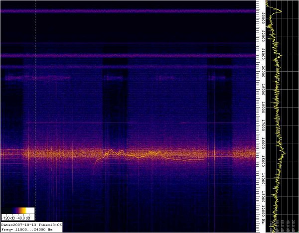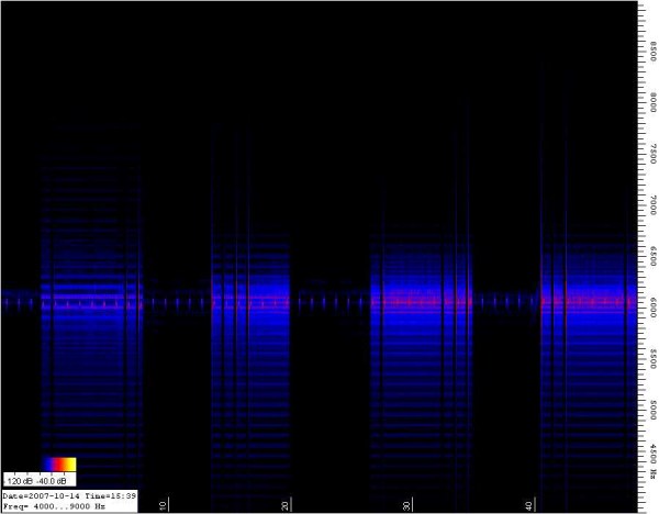 de smalle pulsen rond de 6100 Hertz lijken duidelijk een tijd signaal maar er zit geen enkele vorm van code in het zijn domweg korte pulsjes met een herhalingsfrequentie van 1 seconde Het tweede zeer brede signaal heeft steeds aan het begin en aan het