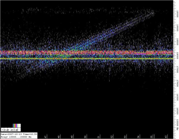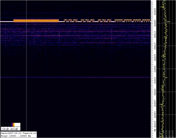 Duidelijk herkenbaar het data signaal met header op 18,2 Kc Verder zijn er nog een aantal zwakkere signalen in het gebied tussen de 17 en 18 Kc en een constante draaggolf op 15,7 Kc My first reception using SpectrumLab and my antenna , a nice data signal around 18 K/c |