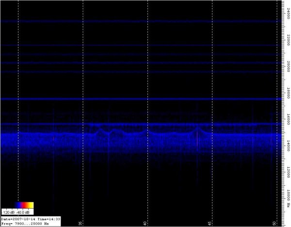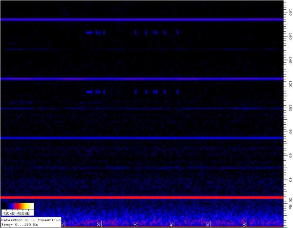 Een zeer sterk data signaal op 24,5 Kc , op 22 Kc nog een signaal ook met datas's , wat lager een ongemoduleerd signaal , wat lager nog 3 data zenders tussen de 20 en 18 Kc rond de 16 Kc een draaggolf welke 20 seconden aan en daarna 8 seconden uit is en op 15,2 K/c een zeer sterke ongemoduleerde draaggolf |