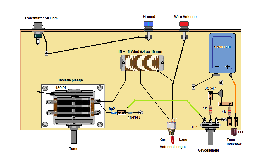 Verder is er een eenvoudige afstem indikator aangebracht in de vorm van een LED welke wordt aangestuurd door een kleine transistor schakeling welke wordt gevoed door een 9 volt batterij . We hebben geen aan/uit schakelaar aangebracht aangezien deze schakeling geen stroom op neemt als er geen zend signaal is . De batterij kan dan ook gemakkelijk enige jaren meegaan .