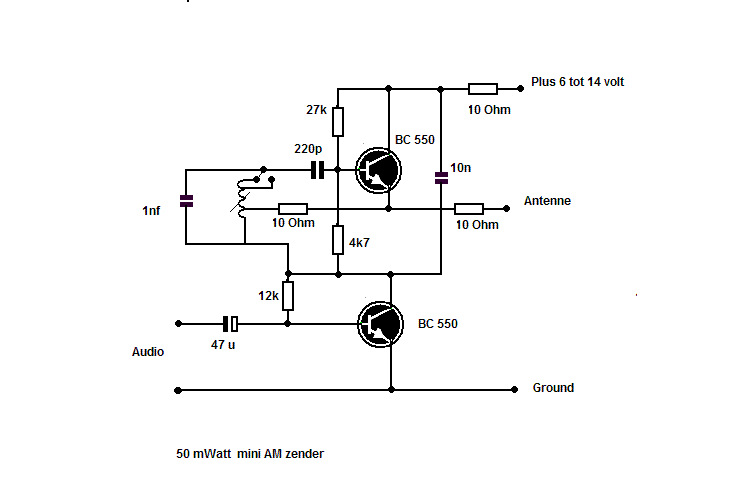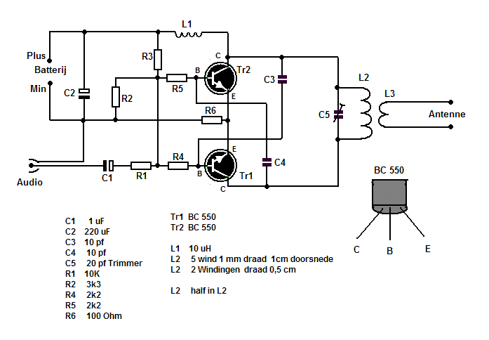 gebruikt van het type BC550 en de zender wordt gevoed met