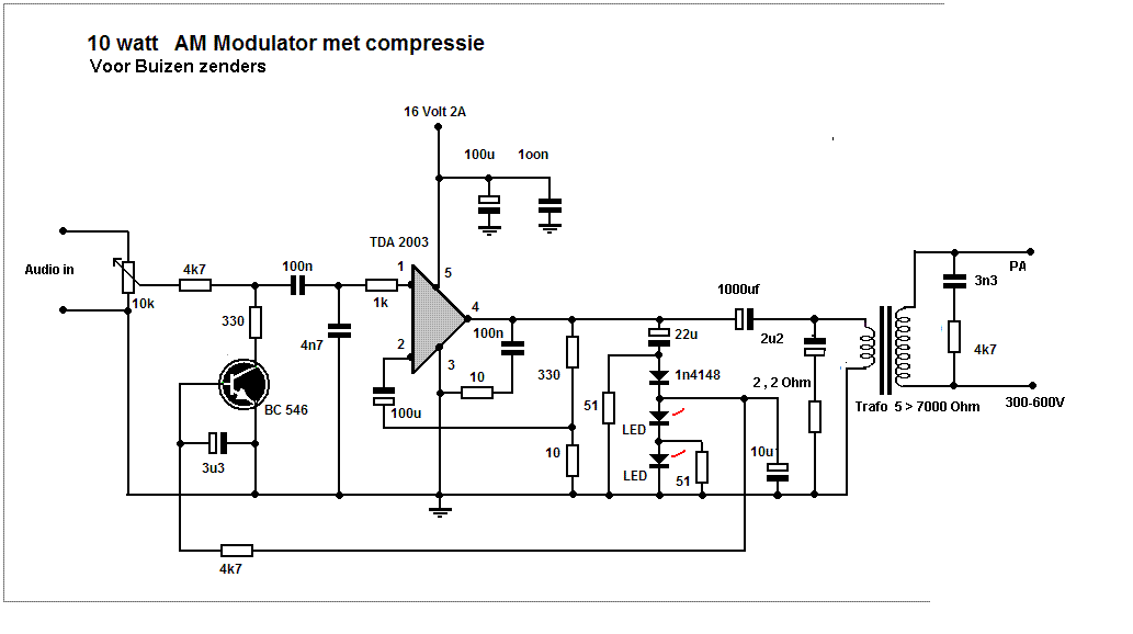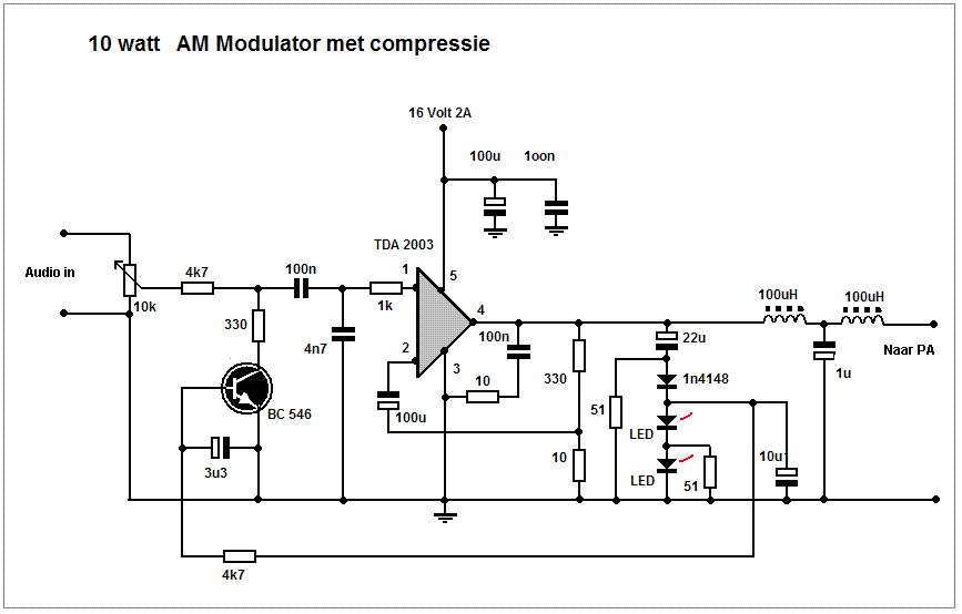 modulatie diepte . Voor een goede verstaanbaarheid is het belangrijk dat de modulatie diepte tegen de 100 % zit zonder dat er overmodulatie intstaat . Bij een lage modulatie diepte zal het geluid veel te veel in de achtergrond ruis blijven steken waardoor het eigenlijk alleen in de directe omgeving van de zender goed hoorbaar is . Bij te veel modulatie . meer dan 100 % ontstaat er enorm veel vervorming en bovendien erg veel gespetter van de eindtrap waardoor er vooral in de omgeving veel storing ontstaat , niet alleen op de radio maar ook op andere elektronische toestellen varierend van computerboxen , telefoon lijnen , maar ook op gevoelige elektronika zoals thermostaten , computers , licht dimmers , enz. Vooral bij muziekweergave is het vaak moeilijk om de goede balans te vinden Bij een instelling waar de zachte passages nog redelijk goed hoorbaar blijven zullen de harde passages al snel overgemoduleerd raken , stel je de modulatie zodanig in dat de harde passsages nog net niet overgemoduleerd zijn zullen de meeste zachtere passages gehee in de ruis verdrinken . Wil je het goed doen zul je dus de een of andere vorm van compressie moeten toepassen , bv. een mooie Optimod 9000 of zoiets , nadeel je hebt daarvoor wel een dikke knip nodig . Met een beetje elektronika is het echter ook gemakkelijk zelf te doen . Bij Amateurzenders werd er vaak een clipper gebruikt . Domweg alles boven een bepaalde sterkte afknippen , voor spraak ging dat wel maar voor muziekweergave geeft dit ontelaatbaar veel vervorming . Bij de hieronder gebruikte schakeling wordt er echte compressie toegepast , de uitgangsspanning van de versterker wordt hier gebruikt om de ingang van de modulator terug te regelen . Het netwerkje met de diode en de twee leds aan de uitgang zorgen voor een gelijkspanning welke afhankelijk van de sterkte een spanning leveren tussen de 0 en 4,2 volt . hierdoor zullen de twee leds oplichten , de eerste bij een spanning tussen de 2,8 en 3,7 volt komt de spanning boven de 3,7 volt zal de tweede led ook mee gaan doen . d.m.v. een lowpass filter bestaande uit twee elkos en een weerstand van 4k7 wordt deze spanning toegevoerd aan de basis van een transistor aan de ingang . komt deze transistor in geleiding dan wordt het ingangssignaal zover verzwakt dat de spanning over de leds weer zakt tot beneden 3,7 volt Op de uitgang van het IC staat de halve voedingspanning , deze wordt gebruikt om de eindtrap van de zender te voeden , de hoeveelheid stroom welke hier kan worden geleverd is voldoende voor een standaard eindtrap met bv. de IRF 520 - IRF 640 , enz In het tweede schema wordt er een modulatie tfafo gebruikt waardoor deze modulator ook geschikt is voor kleine buizen zenders met bv. 1 of 2 maal de EL 84 , een EL36 of zelfs een 807 op niet te veel spanning Als IC is hier een TDA 2003 gebruikt , dit IC is primair ontworpen als eindversterker voor autoradio's en kan een flinke overbelasting verdragen .